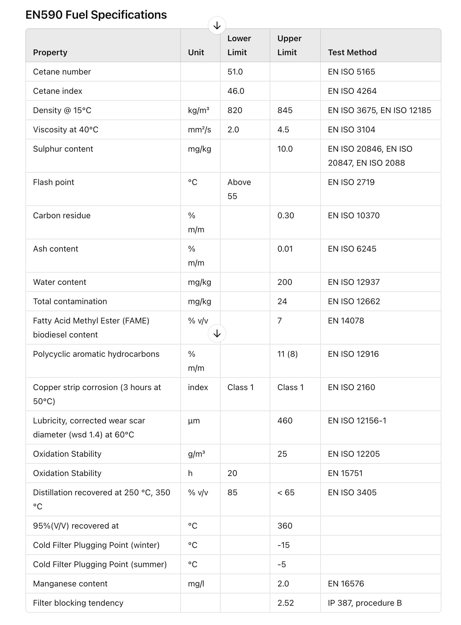 The table below outlines the EN590 standards, including the permissible blending of up to 7% Fatty Acid Methyl Ester (FAME) biodiesel with conventional petrochemical diesel.